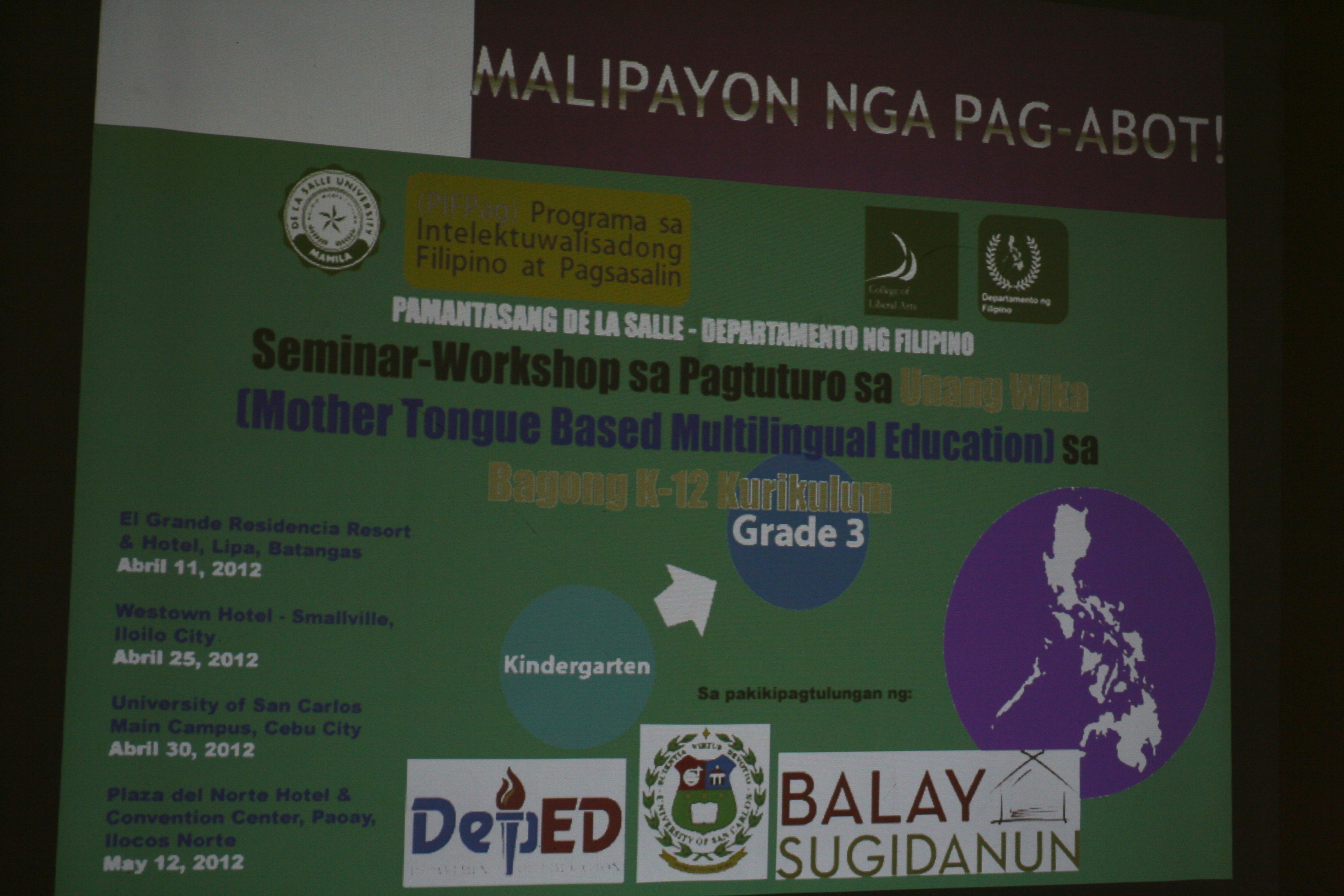 Madinalag-on kag mabinungahon ang pagdagyaw kang Balay Sugidanun sa Pambansang Seminar-Workshop sa Mother Tongue sa K-12 nga programa kang DepED nga gintukod kang Programa sa Intelektwalisadong Filipino at Pagsasalin (PIFPag) kang Dept. ng Filipino ng De La Salle University-Manila kang Abril 25, 2012 sa Westown Hotel, Iloilo City.