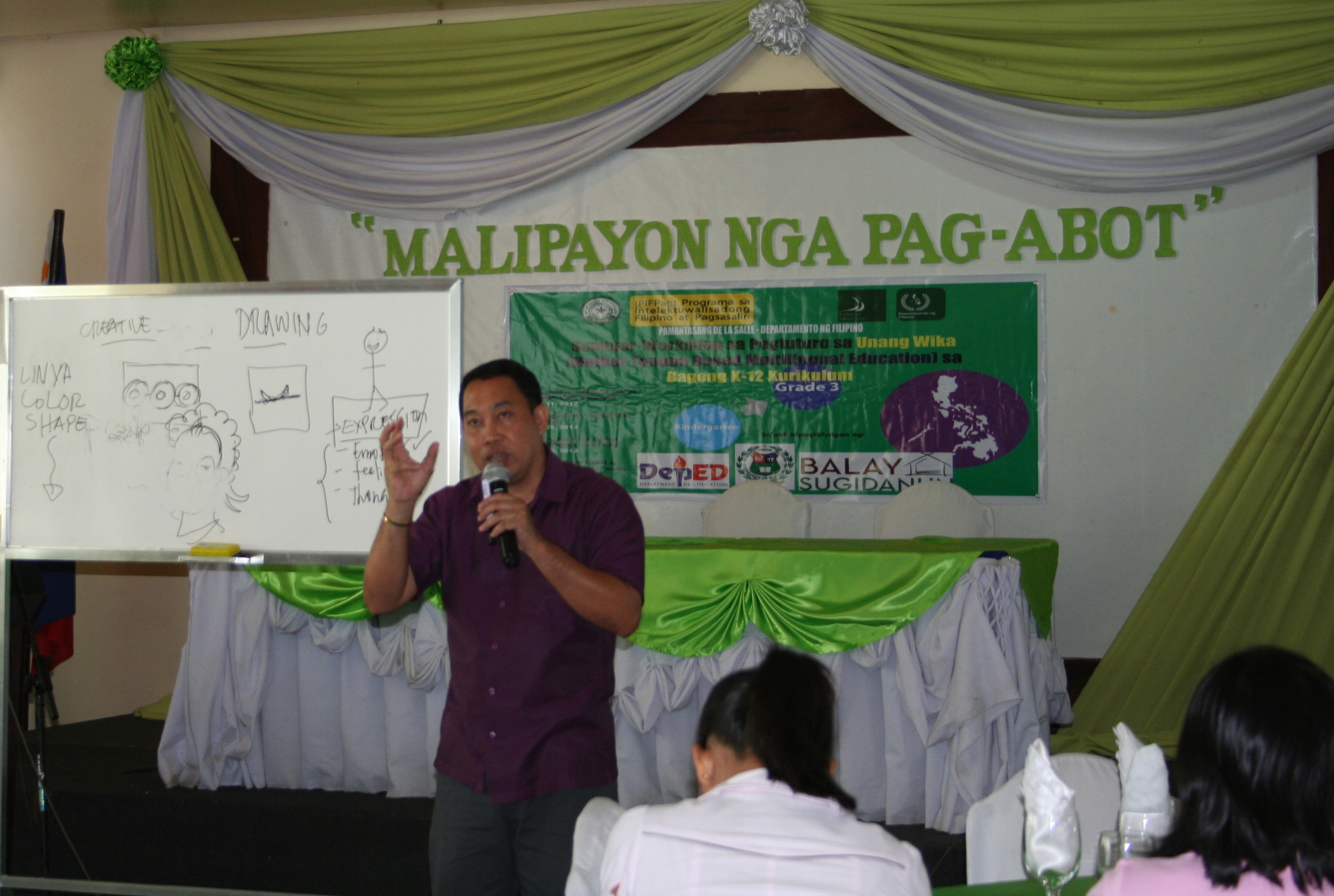 Si Dr. Rakki Sison-Buban kang Dept. ng Filipino kang DLSU-Manila sa anang masinadyahon kag participatory nga paglektyur sa paghanda kang mga materyales pangtudlo.