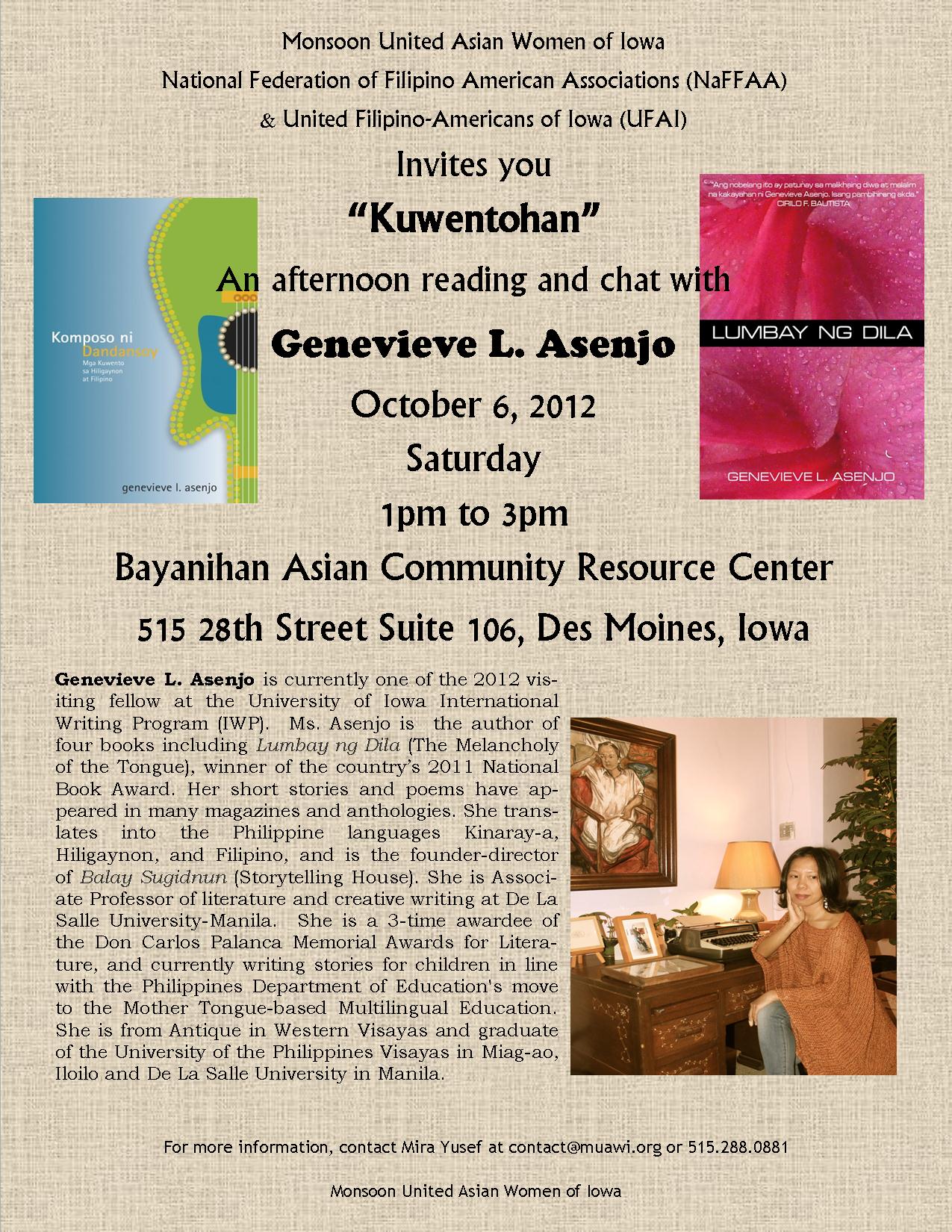 Gen Asenjo Reads @ Des Moines, Iowa, USA October 3, 2012June 23, 2021Categories Archive: Blogs, Archive: Events & Community Engagements, Dayon Kamo: ArchiveGenevieve Asenjo, Monsoon United Asian Women of IowaLeave a Comment on Gen Asenjo Reads @ Des Moines, Iowa, USA Poster by Mira Yusef, MSW. Monsoon United Asian Women of Iowa. Share this: Click to share on Facebook (Opens in new window) Facebook Click to share on Tumblr (Opens in new window) Tumblr Click to share on Pinterest (Opens in new window) Pinterest More Click to email a link to a friend (Opens in new window) Email Click to print (Opens in new window) Print Click to share on LinkedIn (Opens in new window) LinkedIn Click to share on Reddit (Opens in new window) Reddit Like Loading... Related Published by Pangga Gen View all posts by Pangga Gen