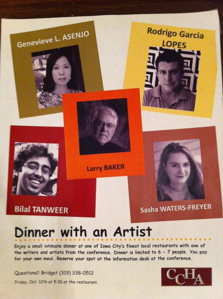 Poster of “Building a City of Words,” featuring three writers from the International Writing Program (IWP) of The University of Iowa in the Community College Humanities Conference hosted by Kirkwood College on October 12, 2012 at the Sheraton Hotel, Iowa City. Genevieve Asenjo joins Bilal Tanweer of Pakistan, Rodrigo Lopes of Brazil, and American writers Larry Baker and Sasha Waters-Freyer in an afternoon of reading and discussion and intimate dinner with the participants composed of literature and language teachers.