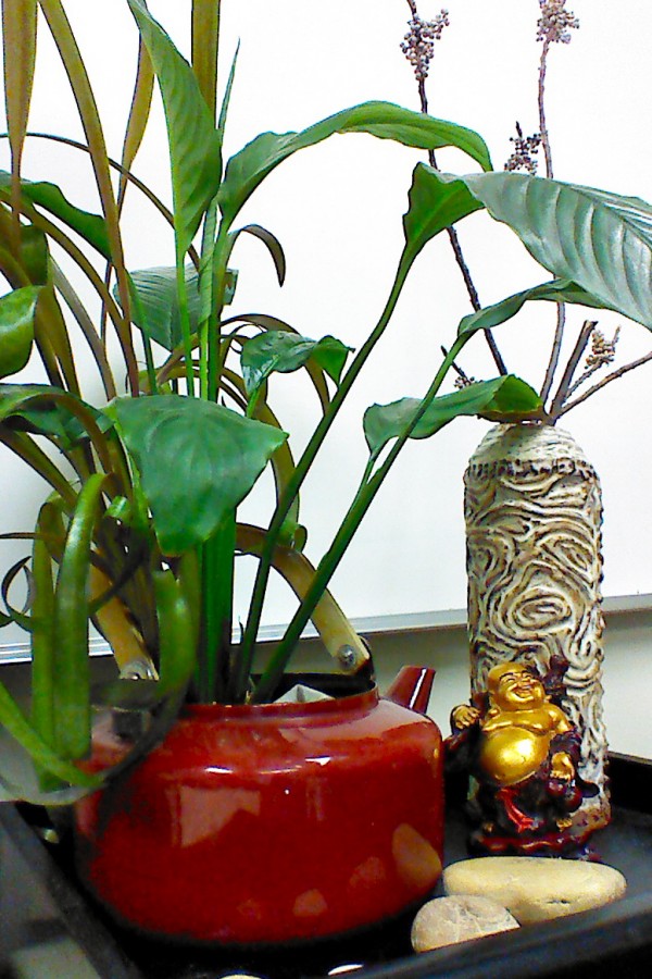2.“Takuri nga Pula” – nasadyahan gid ako pagkakita ko ka pula nga takuri nga may karaptan nga kawayan. Kumpleto ang takup pero wara ako it tuyo nga padayunon ang kabuhi na kadya bilang takuri. Nangin makawiwili nga $2 nga taramnan dya sa opisina kang akun Peace Lily nga nagbulak ka sarang tuig. Ang baraghal nga ceramic flower vase, $1 pero ang figurine nga Little Buddha libre bangud kon lampas a las tres it hapon sa Domingo, ang indi mabaligya ginapabay-an run lang sa kon sin-o may gana magpurot. Ang kon ano gid man nga mabilin, ibasura gid lang. Ang dried twigs sa flower vase bulak kang matag-as nga mga hilamon nga akun ginpuksi kato sa baybayun kang Sandy Hook, NJ.