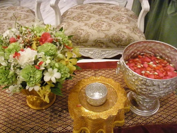 Ang Songkran amo ang tyempo kang mga Thais nga magbisita sa mga pinalangga nga ginikanan kag kaparyentihan. Sa mga Thais nga mga Buddhists, nagaagto man sanda sa mga templo kag magtugro respeto sa mga monks. Sa pagbisita nanda sa anda mga ginikanan kag kamal-aman, nagapakita sanda respeto paagi sa pagbubo tubig. Ang mga mal-am magbubo tubig sa tangkugu kang mga kabataan samtang nagahambal kang blessing ukon pangamuyo para sa ikamayad lawas kang mga bata. Ang mga kabataan magbalos man bubo tubig sa alima kang mga mal-am, kag maghambal man kang blessing ukon pangamuyo. Pagkatapos kang seryoso nga seremonya nga dya, umpisa run ang sadya-sadya nga basyahanay tubig sa palibot.