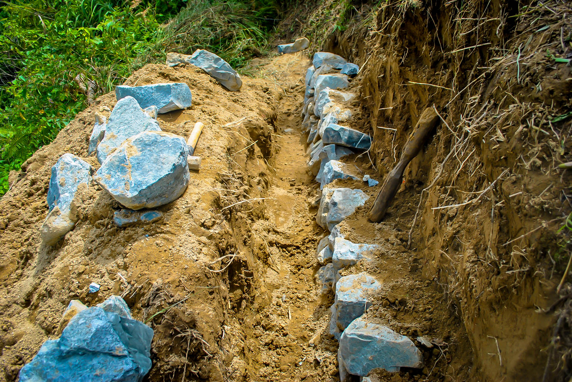 Sa darwa ka adlaw, nagburuligay kami hakot kang bato para himuon nga pader kang Rice Terraces. Ang mga baye tana, nagpanggapas kang mga hilamon. Amo kuno dya ang tradisyonal nga paghururay kang obra. Bug-at ang mga bato amo nga para lang dya sa mga laki. Sara-sara namun nga ginatungtong sa abaga kag saka-dulhug nga ihatud sa lugar nga patindugan kang foundation. Indi man basta-basta ang pagpatong-patong ukon pagriprap kang bato para himuon nga pader. May technique dya. Ginpakita kanamun kang taga-Banaue nga taga-riprap. Wara ti semento nga ginagamit, amo nga ginapili gid ang kada bato nga itungtong nga daw nagapatindug ikaw kang jigsaw puzzle.