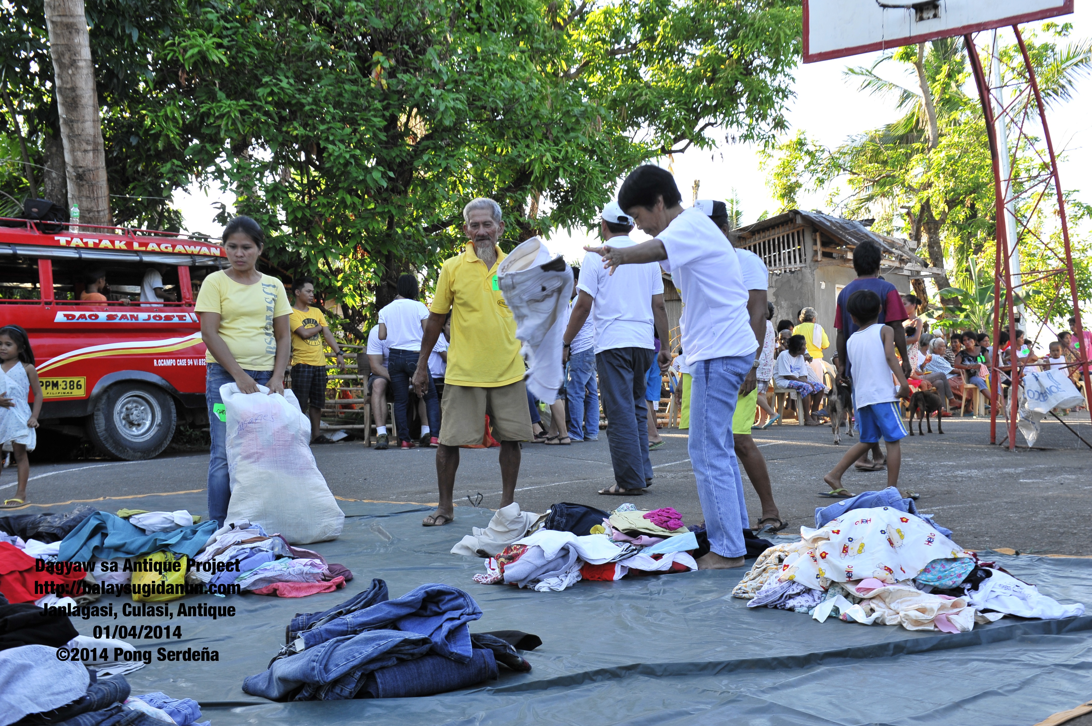 Past 4, when the different sharing groups were done, we served arrozcaldo, pancit, and bread. After, a tolda was spread out in the plaza. We brought out the sacks of clothes donated by The Manila Residences Tower in Taft Avenue where I am staying, transported with discount given by the bus conductor and driver of Dimple Star in Pasay terminal, and the libreng ukay-ukay started.