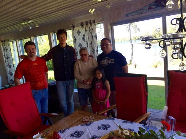 Pasado alas-sais kang manyapon kami. Sinugba nga baboy kag hotdog, lettuce salad nga may kinihad nga kamatis kag sandiya, kag potato salad. Nasadyahan gid si Juliet hay may Coke. Sanday Jonas, Oscar, kag Mimi nag-beer. Kami tana ni Margarita, nag-red sweet wine. Manugtapos rën kami kaën kang mag-abot ang bana ni Margarita. Halin dya sa andang farm. Bahël nga laki nga parakadlaw kag wara’t untat ang estoryahanay nanda ni Juliet sa Svenska.