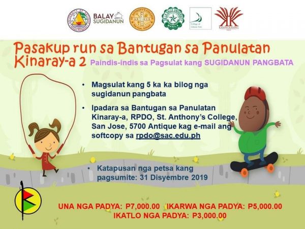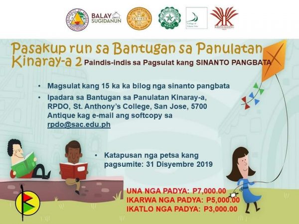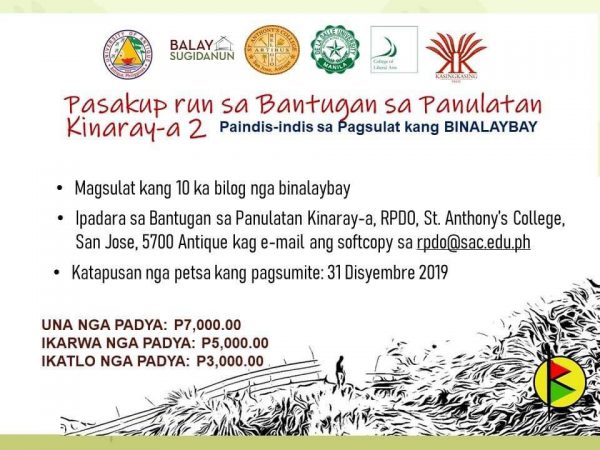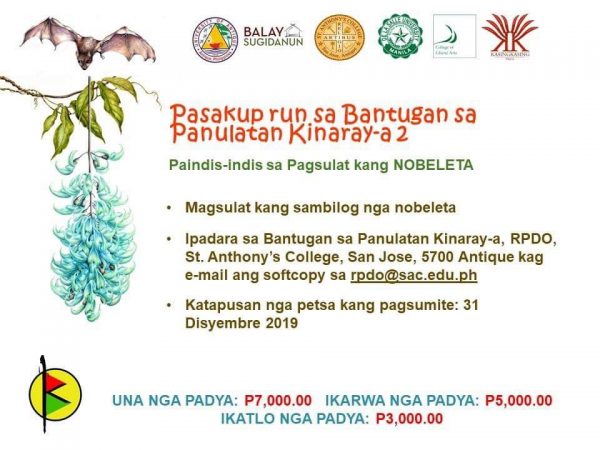 Pasakup run! 5 ka Padya sa Bantugan sa Panulatan Kinaray-a 2 December 4, 2019June 23, 2021Categories Archive: Kinaray-a, Dayon Kamo: ArchiveAntique, Balay Sugidanun, De La Salle University, Philippine Languages, Philippine LiteratureLeave a Comment on Pasakup run! 5 ka Padya sa Bantugan sa Panulatan Kinaray-a 2 Para sa dugang nga impormasyon, magbisita sa Facebook Page kang Bantugan sa Panulatan Kinaray-a. Share this: Click to share on Facebook (Opens in new window) Facebook Click to share on Tumblr (Opens in new window) Tumblr Click to share on Pinterest (Opens in new window) Pinterest More Click to email a link to a friend (Opens in new window) Email Click to print (Opens in new window) Print Click to share on LinkedIn (Opens in new window) LinkedIn Click to share on Reddit (Opens in new window) Reddit Like Loading... Related Published by Pangga Gen View all posts by Pangga Gen