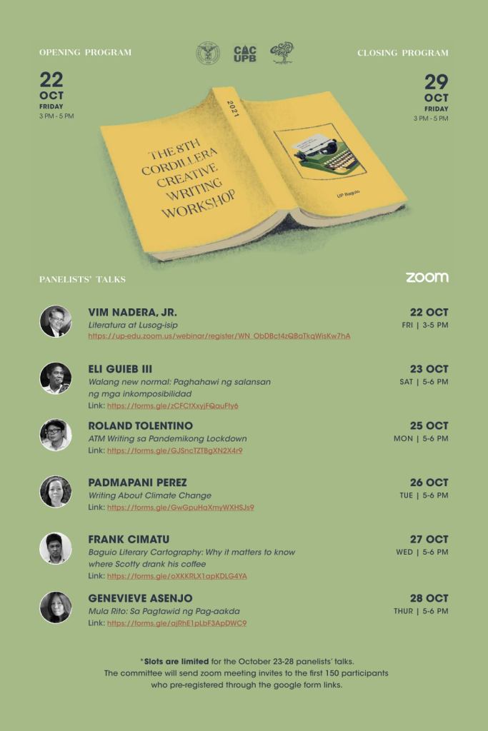 Panelists’ Talks @ the 8th Cordillera Creative Writing Workshop October 22, 2021Categories Balay Sugidanun, Blogs, LectureBalay Sugidanun, Genevieve AsenjoLeave a Comment on Panelists’ Talks @ the 8th Cordillera Creative Writing Workshop Isa tayo sa mga panelist ngayong taon sa ika-walo na Cordillera Writing Workshop na magbubukas ngayong hapon ng 22 Oktubre 2021. Para sa karagdagang detalye, bisitahin ang Facebook Page ng Cordillera Creative Writing Workshop. Share this: Click to share on Facebook (Opens in new window) Facebook Click to share on Tumblr (Opens in new window) Tumblr Click to share on Pinterest (Opens in new window) Pinterest More Click to email a link to a friend (Opens in new window) Email Click to print (Opens in new window) Print Click to share on LinkedIn (Opens in new window) LinkedIn Click to share on Reddit (Opens in new window) Reddit Like Loading... Related Published by Pangga Gen View all posts by Pangga Gen