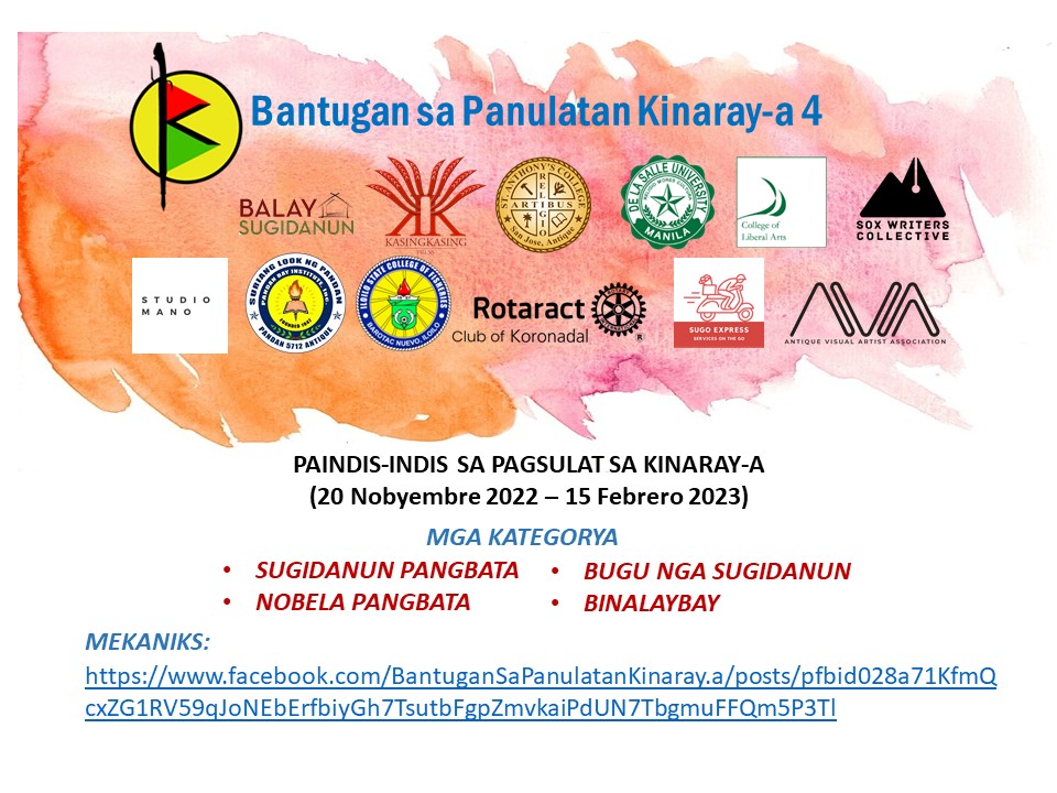 The Bantugan sa Panulatan Kinaray-a (BPK), an international literary tilt in Kinaray-a is now on its fourth edition, and is accepting entries until 15 February 2023. The fourth edition features categories for story for children, novel for children, short story, and poetry. The contest mechanics can be accessed at https://www.facebook.com/BantuganSaPanulatanKinaray.a/posts/pfbid028kG1cp39SSMtLDGepQU9dBRau5yYZETHYgkBhYeoSWesQ8BuNgPcTa2UutqKX6R3l . The BPK advocates literacy development through the production and dissemination of quality literature; the recognition of Kinaray-a literary artists and their works; and the appreciation of the Kinaray-a language and its dynamism in various locations. The BPK also holds on-line writing workshops called Kahirupan Bantugan sa Pagsulat to help writers hone their writing skills and get introduced to the Kinaray-a literary community. The BPK is co-organized by St. Anthonyās College, Kasingkasing Press, Literature Department of the De La Salle University, Balay Sugidanun, Antique Artists Association, Sugo Express, Rotaract Club of Koronadal, SOX Writers Collective, Pandan Bay Institute Inc., Studio Mano, and Iloilo State College of Fisheries.